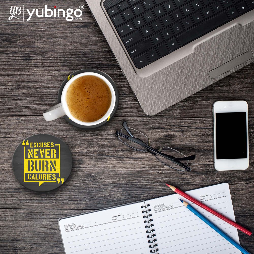 • This Excuses Never Burn Calories Coaster Set is printed specially for you. Be a great host and offer your guests this designer printed coaster under their glasses. Ease your burden and add a personalised touch to your next party with custom printed coasters. Amazing looks with cool printed designs, these coasters perfectly transition from cocktail hours to receptions. It's waterproof and backed with cork, will protect your furniture from scratch and stains. The patterns are printed by heat press machine, printed in full colour durable finish. Can be wiped clean. It can also be used as a work of art for your home, office or as a gift. Stock up today and never see a water ring again on your furniture! HD quality printing on Wooden MDF makes your coasters look vibrant and cool. This Excuses Never Burn Calories coaster set is having 9.5Cm size and that's perfect for glass, bottles or mugs of various sizes. This stylish coaster set is from our Quotes/Messages collection and will be made for you within 24 hours after you place the order.