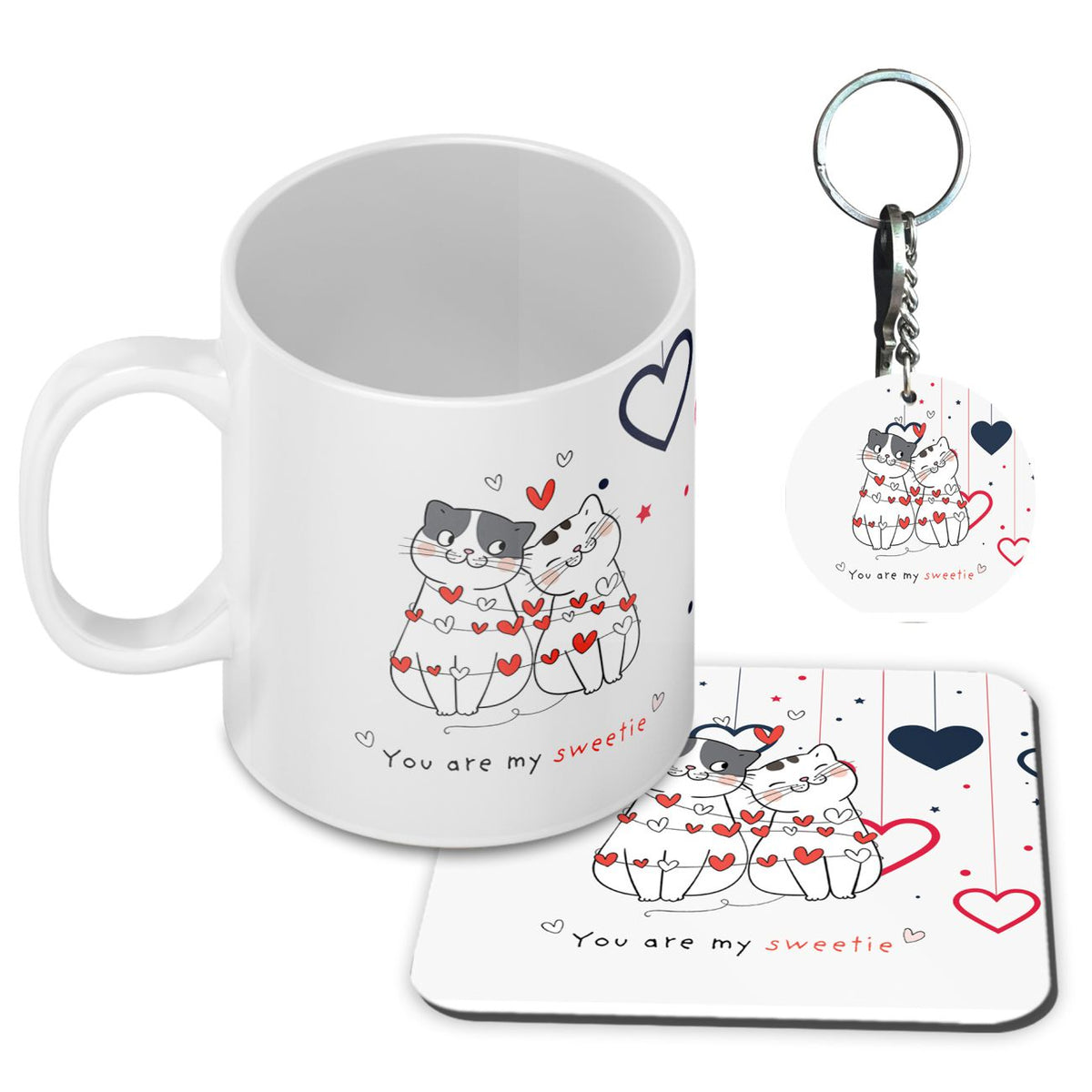 PERFECT SIZE : This "Hugs and Kisses" designer coffee mug holds 325 Ml or 11Oz of your favorite drink. The coaster is 9x9cm and key chain is having diameter of 5Cm.