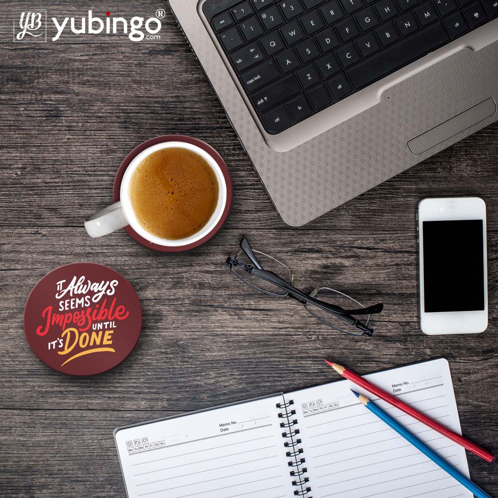 • This Impossible Till Done Coaster Set is printed specially for you. Be a great host and offer your guests this designer printed coaster under their glasses. Ease your burden and add a personalised touch to your next party with custom printed coasters. Amazing looks with cool printed designs, these coasters perfectly transition from cocktail hours to receptions. It's waterproof and backed with cork, will protect your furniture from scratch and stains. The patterns are printed by heat press machine, printed in full colour durable finish. Can be wiped clean. It can also be used as a work of art for your home, office or as a gift. Stock up today and never see a water ring again on your furniture! HD quality printing on Wooden MDF makes your coasters look vibrant and cool. This Impossible Till Done coaster set is having 9.5Cm size and that's perfect for glass, bottles or mugs of various sizes. This stylish coaster set is from our Quotes/Messages collection and will be made for you within 24 hours after you place the order.