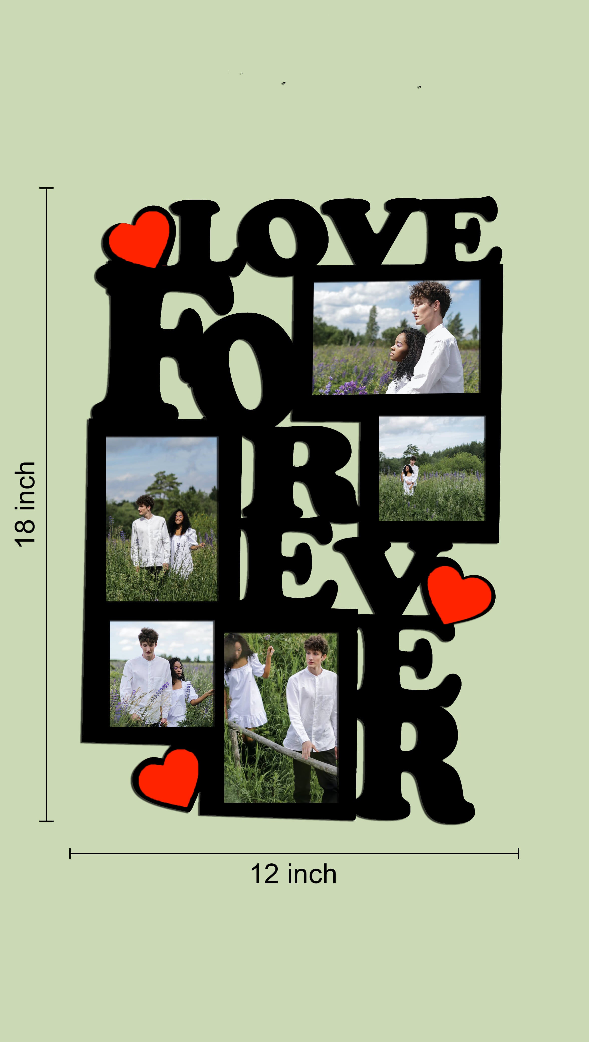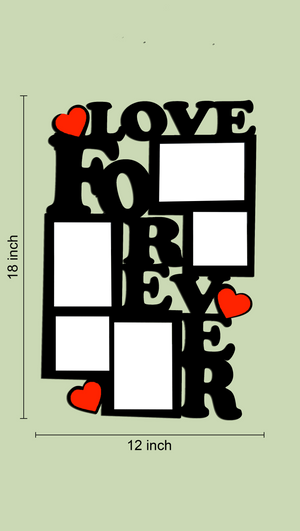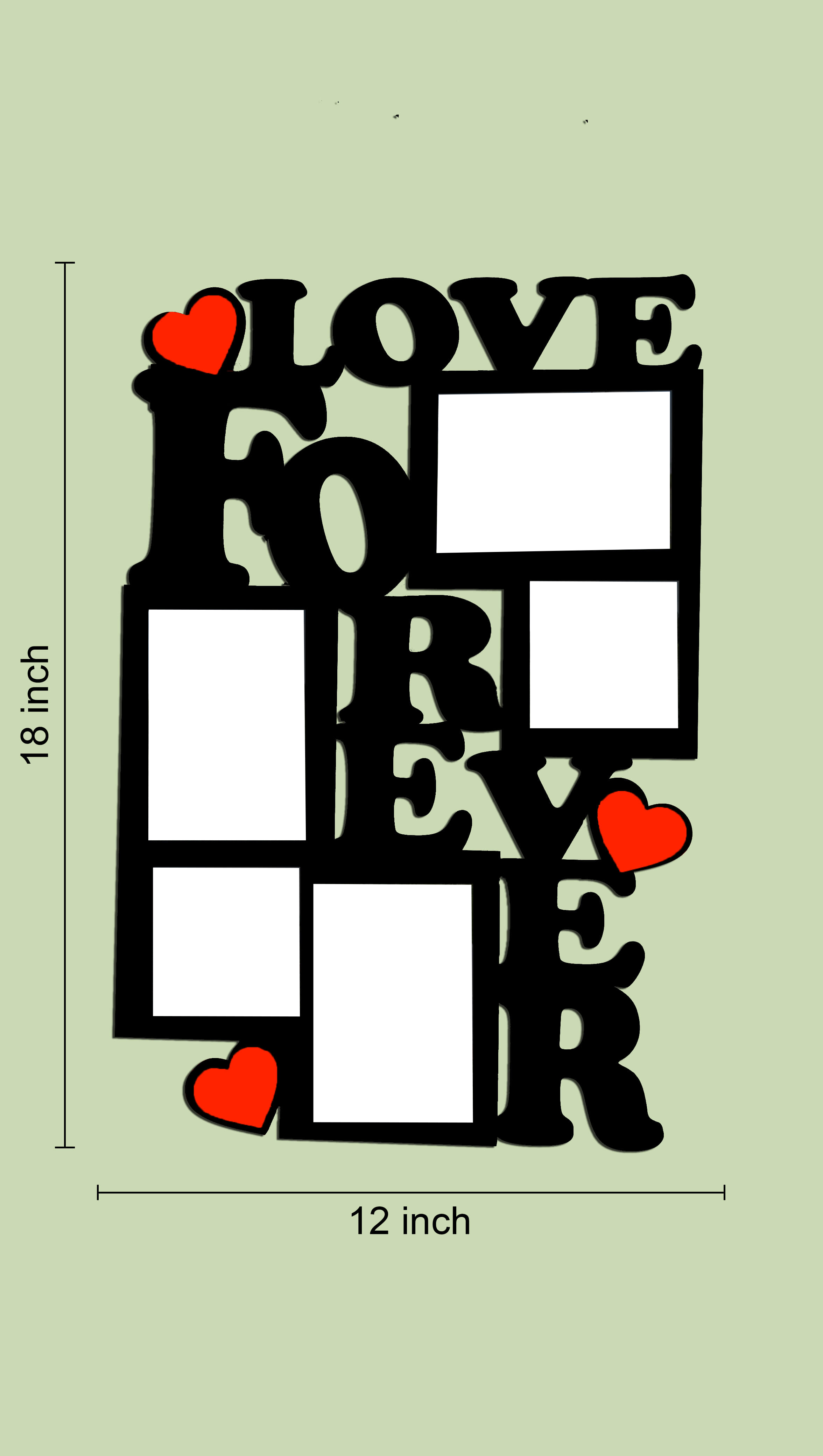 Keep your cherished memories alive with this beautiful photo frame featuring a laser-cut "Love Forever" design on MDF wood. Measuring 12 inches wide and 18 inches tall, this frame can hold up to five photos and is perfect for displaying on your wall. The MDF wood material ensures durability and long-lasting use. This photo frame makes a wonderful gift for a loved one or a great addition to your home decor.