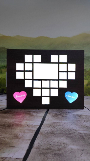 This LED Collage Frame features a heart-shaped collage design and measures 8x11 inches in size. It comes with a sliding photo feature and can be printed using various printing technologies such as sublimation print, inkjet photo paper, inkjet backlight, and more. The frame has an in-built power supply and does not require an extra adapter. It is also easy to print with a single sheet and change photos. The package includes Sublimation PVC for printing.