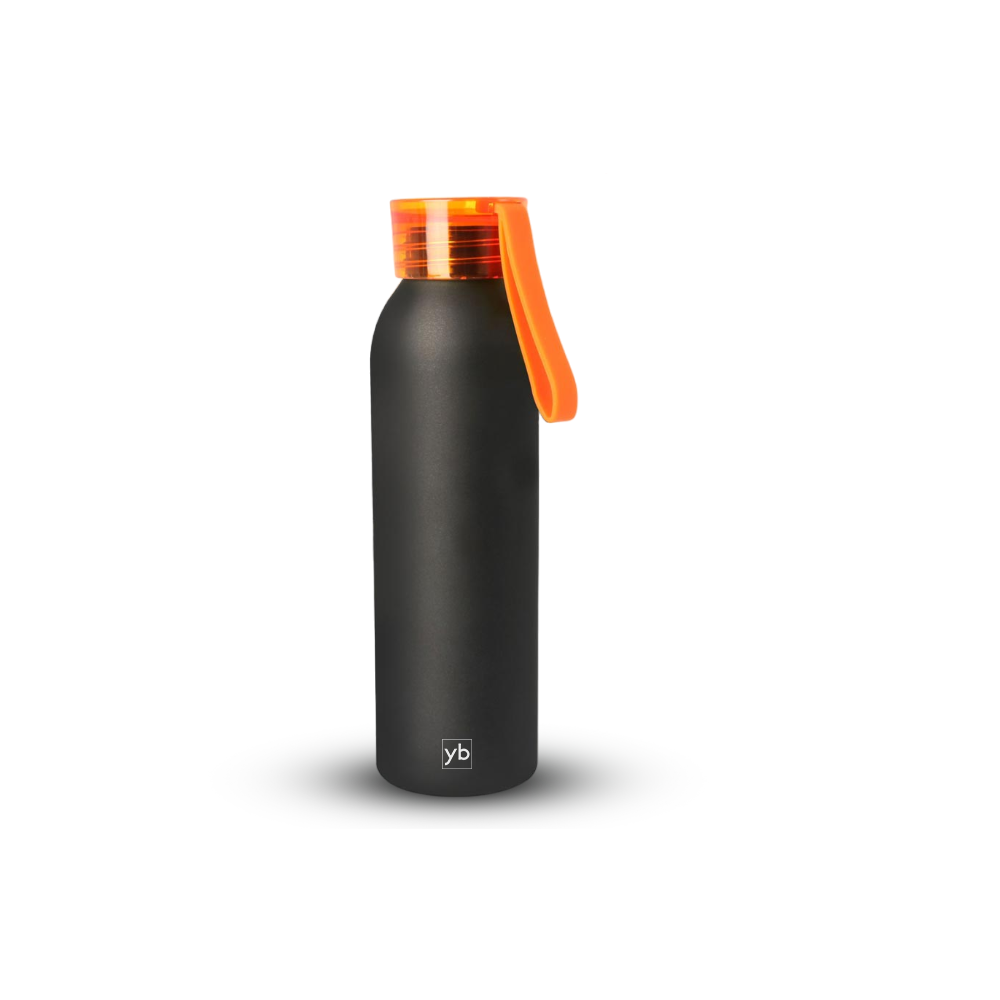 Stay hydrated in style with our Metal Water Bottle with Silicon Carry Strap! This bottle features a sleek matte black finish and comes with a colored plastic cap with a convenient silicon carry strap, making it easy to take with you wherever you go. It stores approximately 600ml of liquid and can be engraved with silver lettering for a personal touch. It comes in a white box packing, making it a great option for promotions or as a gift. Available in blue, red, yellow, and orange colors.