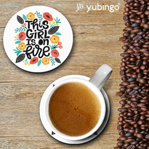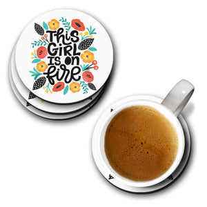 • This This Girl is One Fire Coaster Set is printed specially for you. Be a great host and offer your guests this designer printed coaster under their glasses. Ease your burden and add a personalised touch to your next party with custom printed coasters. Amazing looks with cool printed designs, these coasters perfectly transition from cocktail hours to receptions. It's waterproof and backed with cork, will protect your furniture from scratch and stains. The patterns are printed by heat press machine, printed in full colour durable finish. Can be wiped clean. It can also be used as a work of art for your home, office or as a gift. Stock up today and never see a water ring again on your furniture! HD quality printing on Wooden MDF makes your coasters look vibrant and cool. This This Girl is One Fire coaster set is having 9.5Cm size and that's perfect for glass, bottles or mugs of various sizes. This stylish coaster set is from our Girl Zone collection and will be made for you within 24 hours after you place the order.