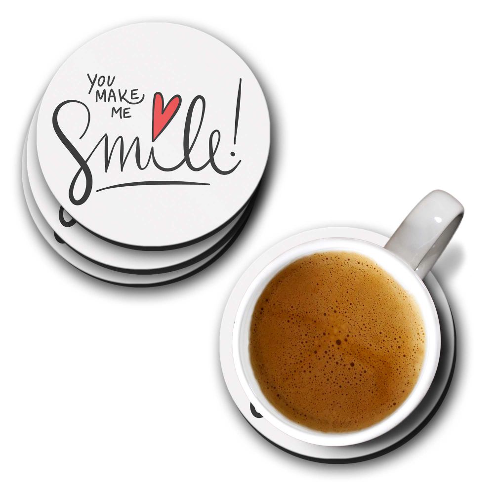 • This You Make me Smile Coaster Set is printed specially for you. Be a great host and offer your guests this designer printed coaster under their glasses. Ease your burden and add a personalised touch to your next party with custom printed coasters. Amazing looks with cool printed designs, these coasters perfectly transition from cocktail hours to receptions. It's waterproof and backed with cork, will protect your furniture from scratch and stains. The patterns are printed by heat press machine, printed in full colour durable finish. Can be wiped clean. It can also be used as a work of art for your home, office or as a gift. Stock up today and never see a water ring again on your furniture! HD quality printing on Wooden MDF makes your coasters look vibrant and cool. This You Make me Smile coaster set is having 9.5Cm size and that's perfect for glass, bottles or mugs of various sizes. This stylish coaster set is from our Quotes/Messages collection and will be made for you within 24 hours after you place the order.